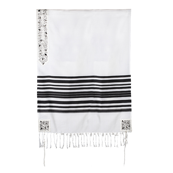טלית 105 ס"מ פסים ארוגים + פינות ועטרה רקומות - רימונים שחור