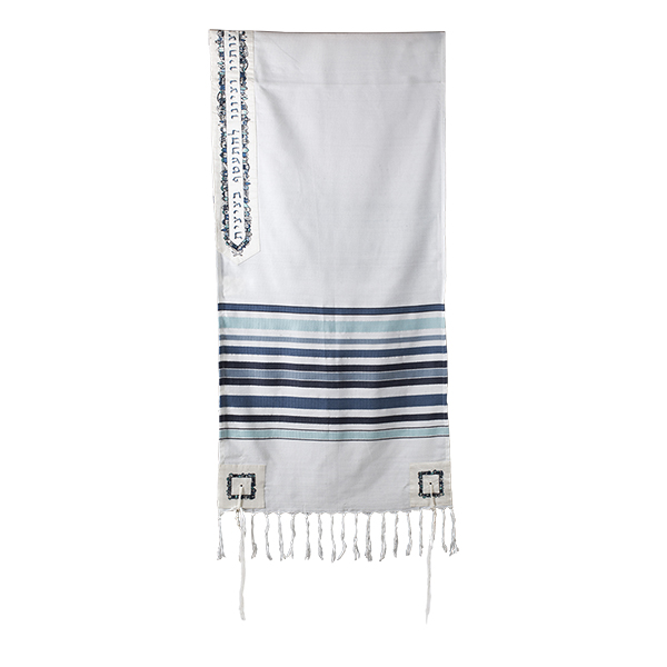 טלית 52 ס"מ פסים ארוגים + פינות ועטרה רקומות - ירושלים כחול