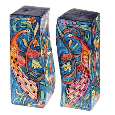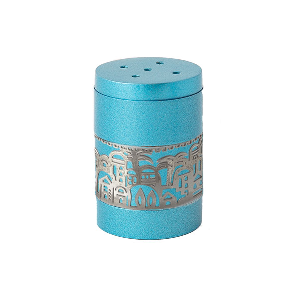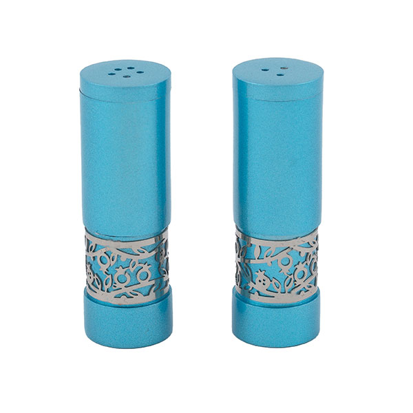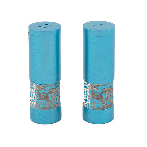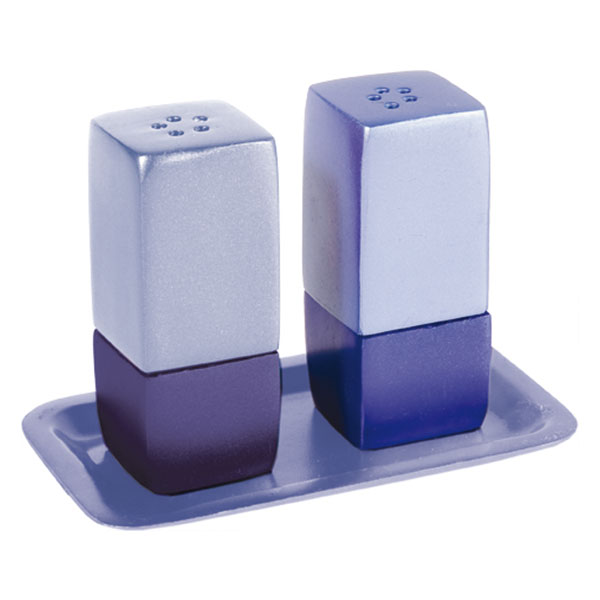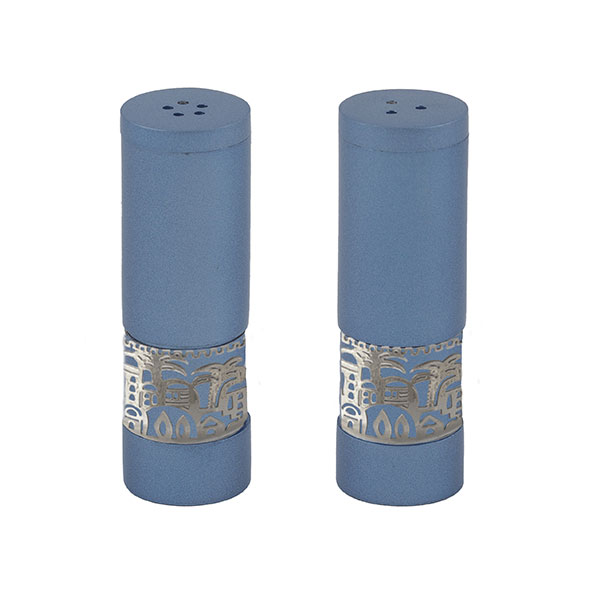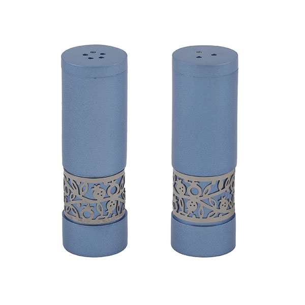 סט המלח והפלפל מעוצב על ידי האמן הירושלמי יאיר עמנואל. המלח פלפל עשויים מניקל, עם מכות פטיש בעבודת יד. הטבעות הכחולות עשויות ממתכת צבועה בצבעי אנודייז. |