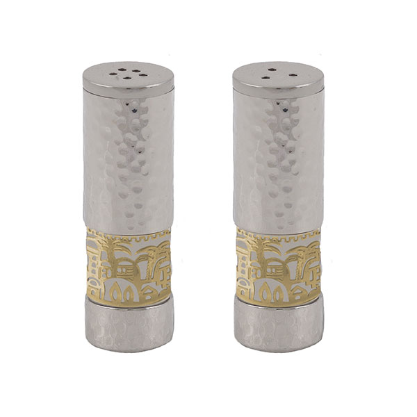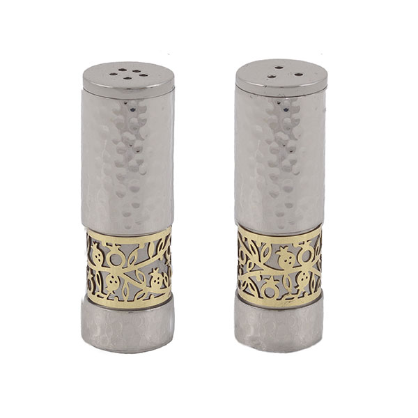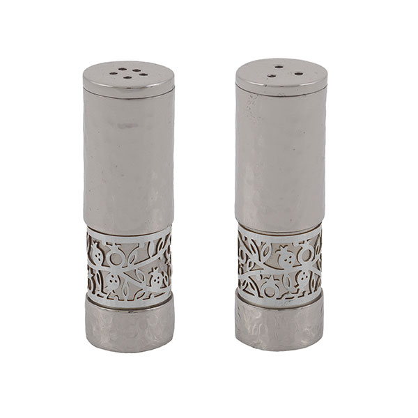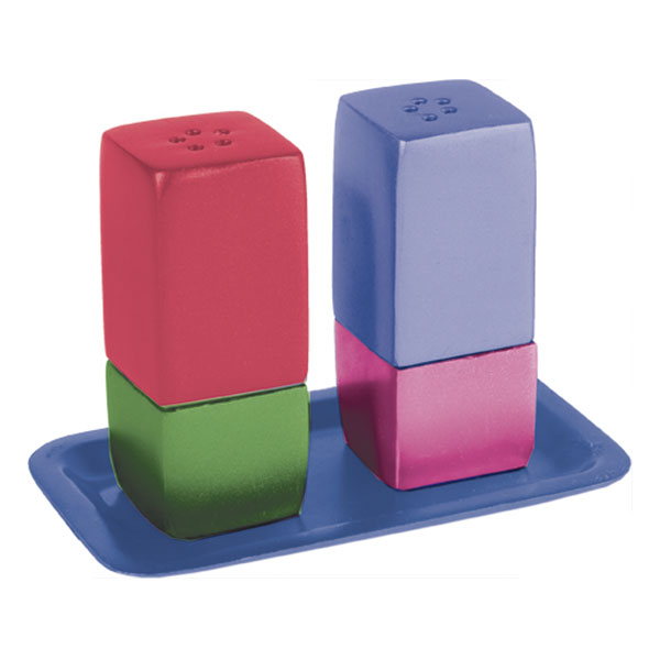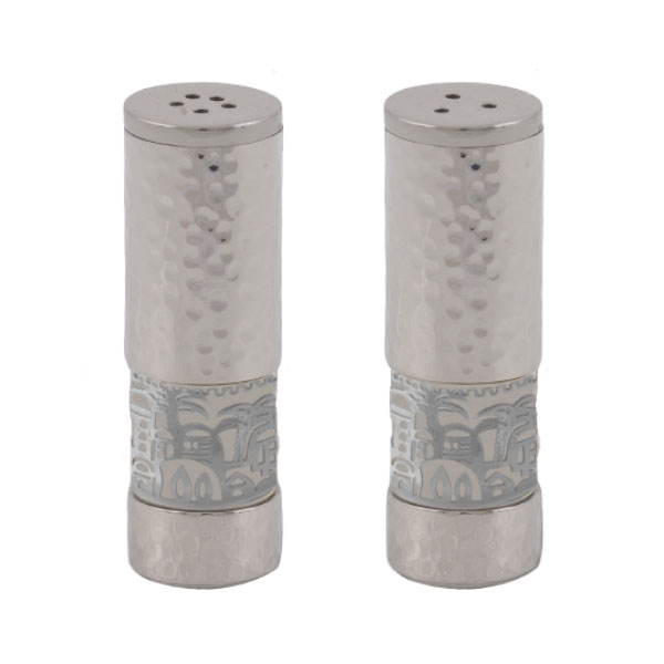 סט המלח והפלפל מעוצב על ידי האמן הירושלמי יאיר עמנואל. המלח פלפל עשויים מניקל, עם מכות פטיש בעבודת יד. הטבעות הצבעוניות עשויות ממתכת צבועה בצבעי אנודייז. |