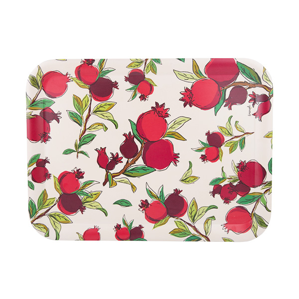 מוצר זה מעוצב ומיוצר על ידי אומן היודאיקה הירושלמי יאיר עמנואל. המגש עשוי מבמבוק ופולימר. על המגש מודפסים רימונים בצורות ובצבעים שונים, הרימון במסורת היהודית הינו סמל של ברכה ושפע.